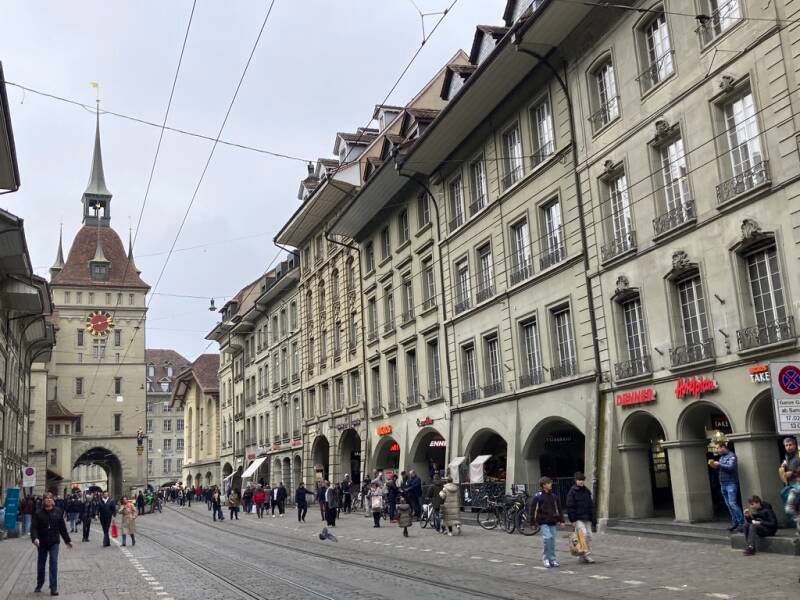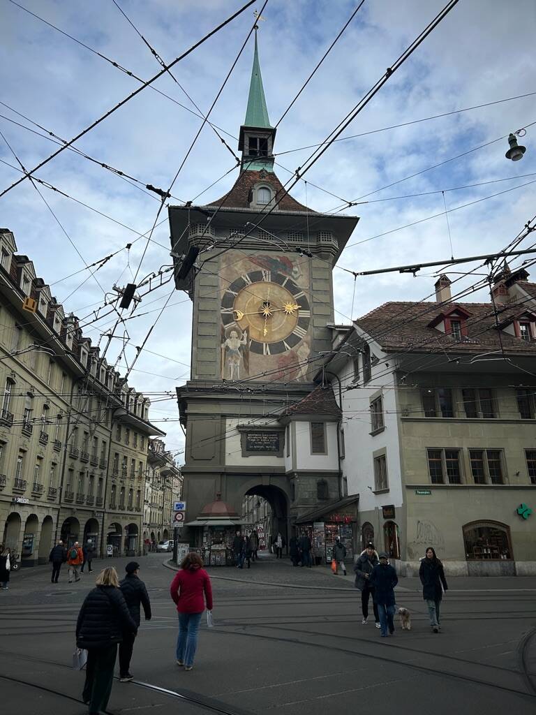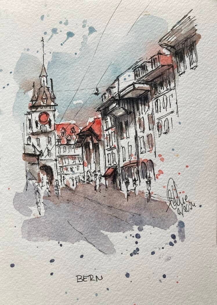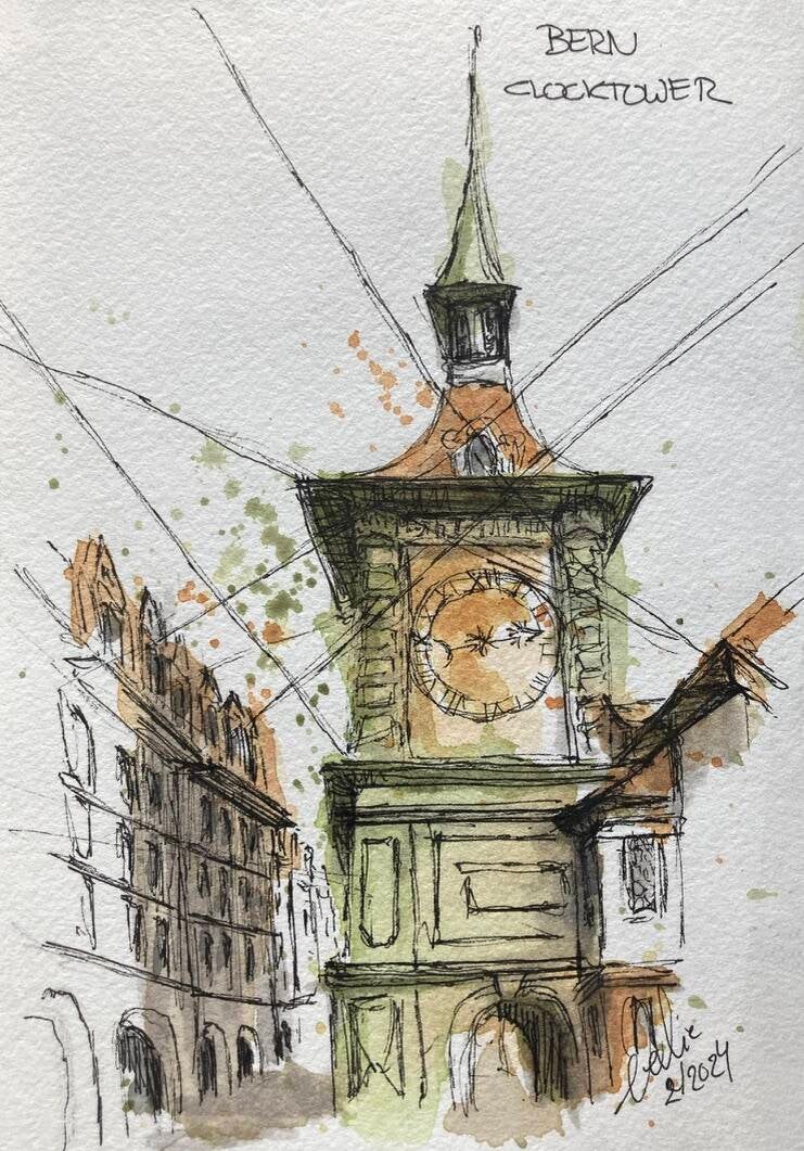 De prachtige kloktoren van Bern. Het klokwerk is werkelijk spectaculair. De toren doorbreekt de lange straat. Als extra vond ik het leuk om een beetje de wirwar aan tramlijnen in de schets te verwerken.