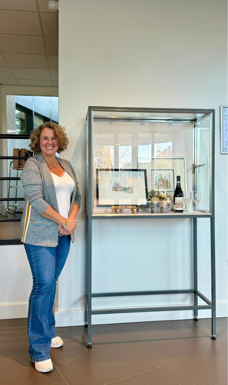 De kleine vitrinekast noem ik de trouwvitrine. Hierin zijn schilderijen van het gemeentehuis en kasteel Wijenburg tentoongesteld. Verder tref je er een mooi bruidsboeket aan in de vorm van een biedermeier, gesponsord door Blom Blom in Ochten. Daarnaast heb ik van de schets van het gemeentehuis een wijnetiket gemaakt, geschilderd met wijn. Diezelfde schets heb ik op twee wijnglazen gegraveerd om het geheel compleet te maken.