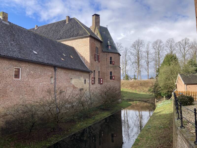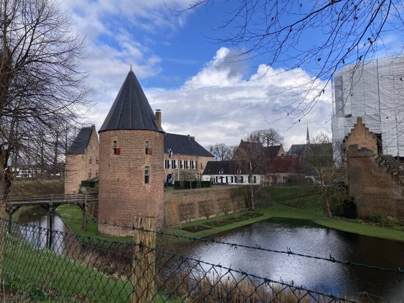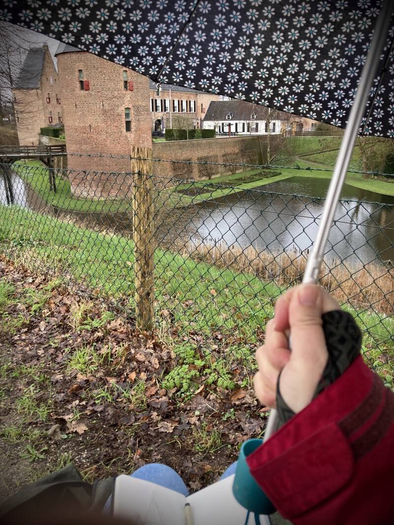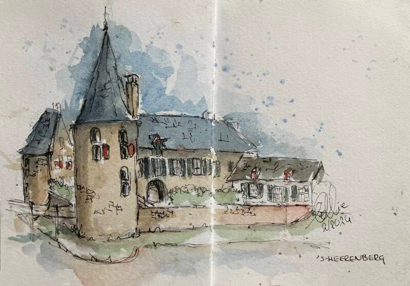 Op zaterdag 24 februari 2024 ben ik voor het eerst met een Urban Sketch groep meegegaan om live te schetsen en schilderen. Locatie: Kasteel 's-Heerenberg. Het was een koude dag met nu en dan een bui. Na het verzamelen bij café De Gracht ging iedereen zijn/haar eigen kant op om een plekje te zoeken. Omdat ik niet wist wat ik kon verwachten ben ik eerst wat rond gaan lopen. Het kasteel zat deels in de steigers en alhoewel dat ook interessant was om te schetsen (het is tenslotte een moment opname), wilde ik toch wat anders.