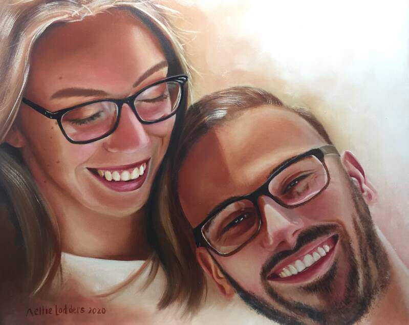 Hoe mooi en intiem de foto ook is, door verschillende lichtinvallen en weerspiegelingen in hun brillen was het een pittig schilderij om te maken. Daarnaast wilde ik juist het intieme karakter van de foto vangen.