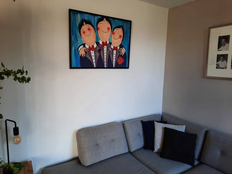 Nu acht jaar later kreeg ik van Heleen een bericht dat ze de woonkamer in een nieuw jasje hadden gestoken. Ze vertelde mij dat het hele gezin unaniem had besloten het schilderij dat ik destijds had gemaakt dezelfde prominente plek te geven als het altijd al had. Dus kreeg het schilderij een prachtig nieuwe lijst van Kaders & Kunst en werd het terug opgehangen waar het al acht jaar lang volop vrolijkheid heeft gebracht.