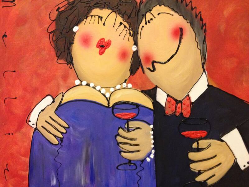 Acht jaar geleden ben ik begonnen met schilderen. Naast het "gewoon" leren schilderen, leek het mij leuk om zo nu en dan een specifieke workshop te doen. Zo ook een "dikke dames" workshop. Een leuke workshop met een hapje en een drankje en vooral veel gezelligheid. Ik heb toen dit schilderij van twee mensen aan de borrel geschilderd.