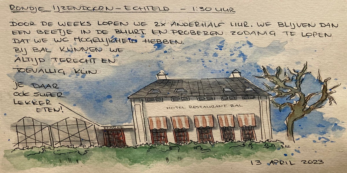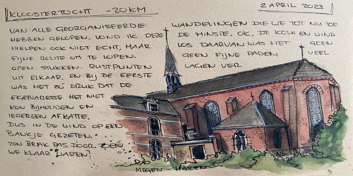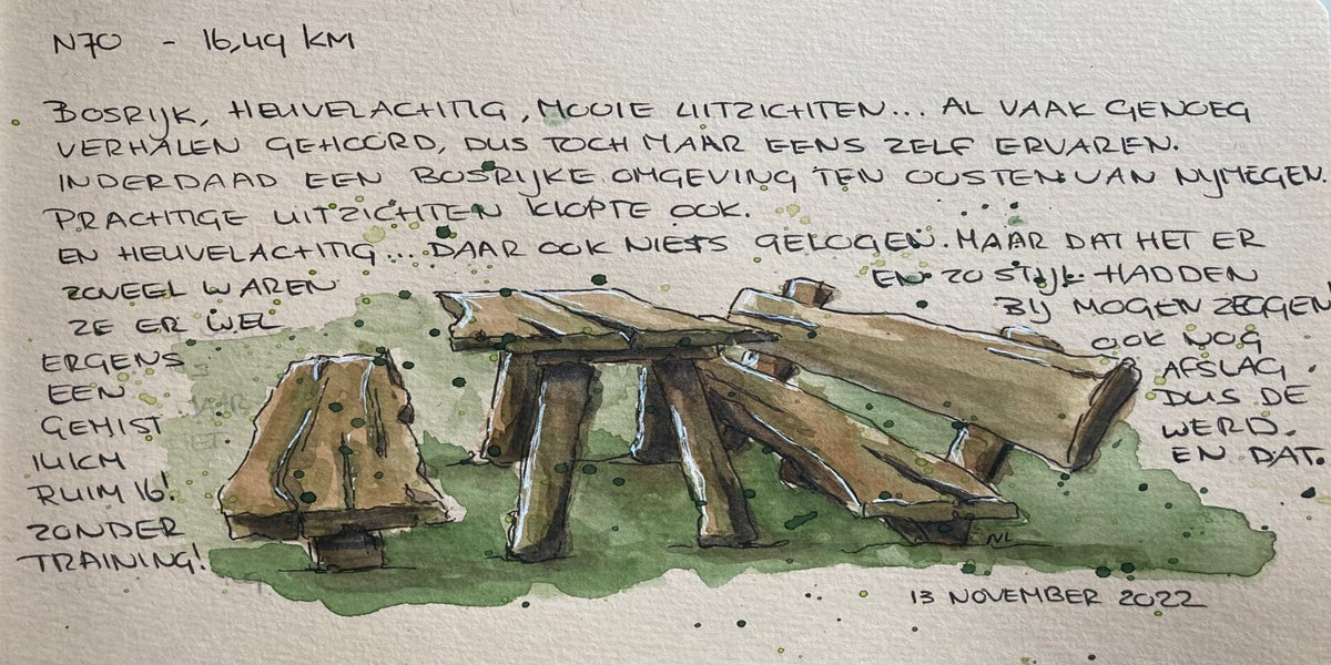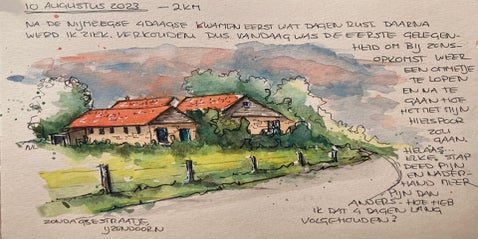 Tijdens de trainingen begon ik te tekenen wat ik onderweg tegenkwam – paadjes, uitzichten, rustmomenten. Zo ontstond mijn wandelboekje: een persoonlijk verslag in lijnen en kleuren.